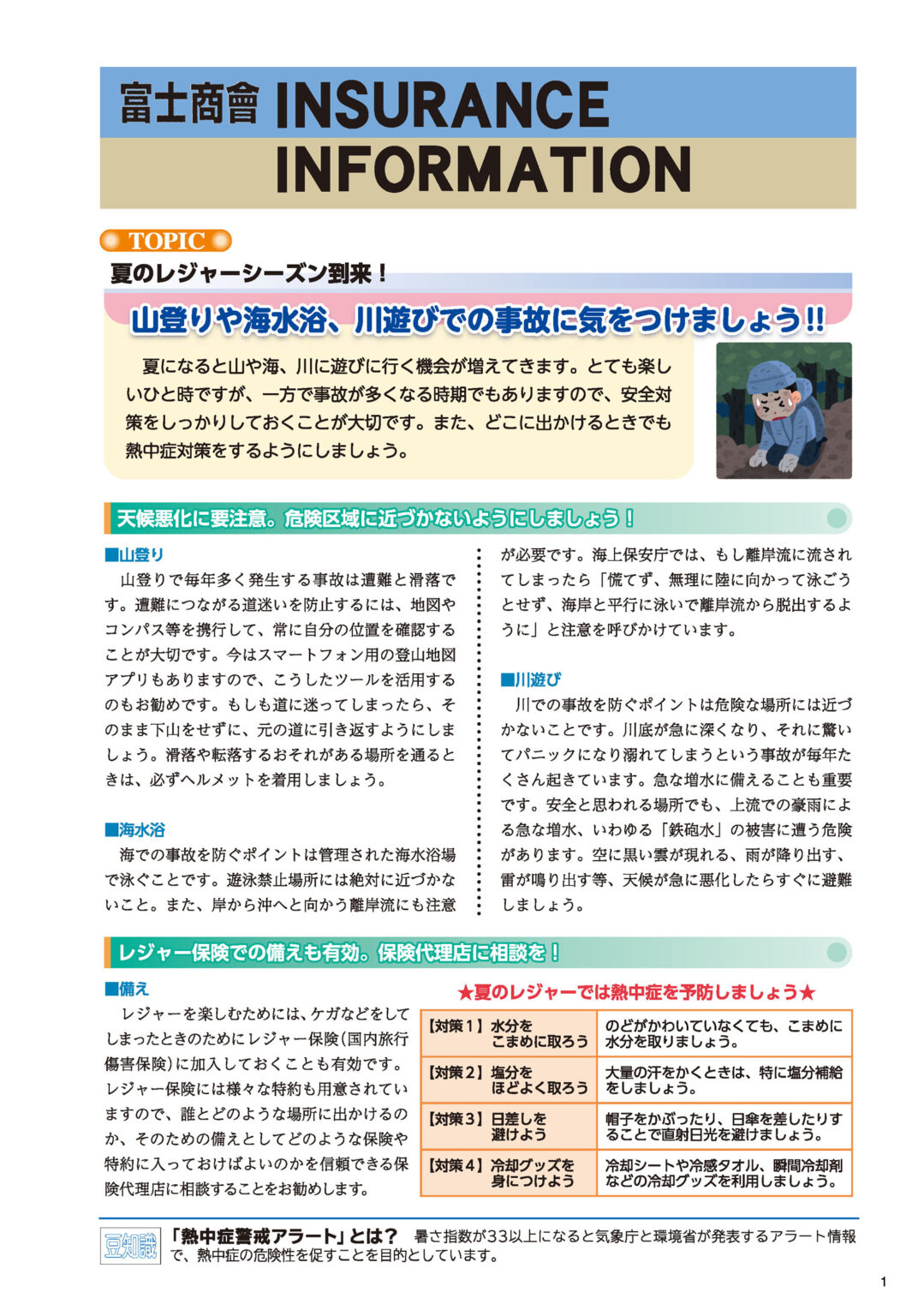 登山では地図やコンパスの携行やヘルメット着用、海では管理された海水浴場の利用と離岸流対策、川では急な増水への注意、レジャー保険加入の有効性や具体的な熱中症予防策もご紹介しています。