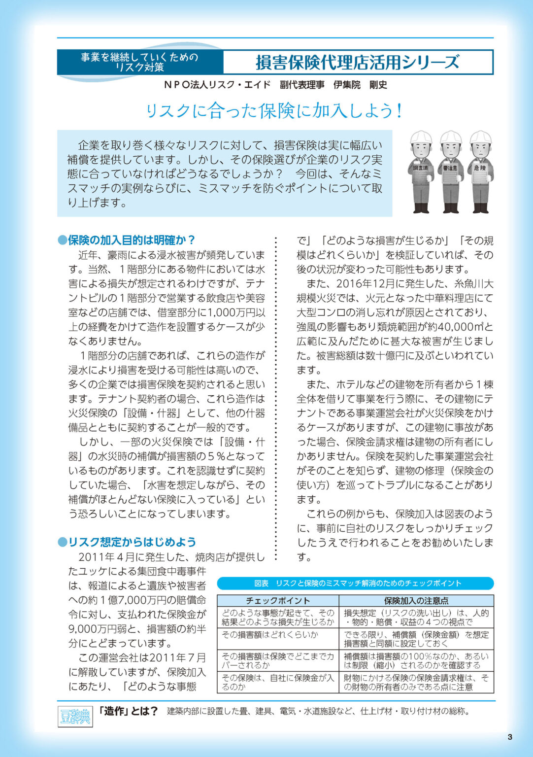 浸水や火災、食中毒など過去事例を挙げつつ、人的・物的・賠償・収益などの損害想定と補償額の整合性、造作の扱い、保険金請求権の帰属などミスマッチを防ぐためのチェックポイントを解説しています。